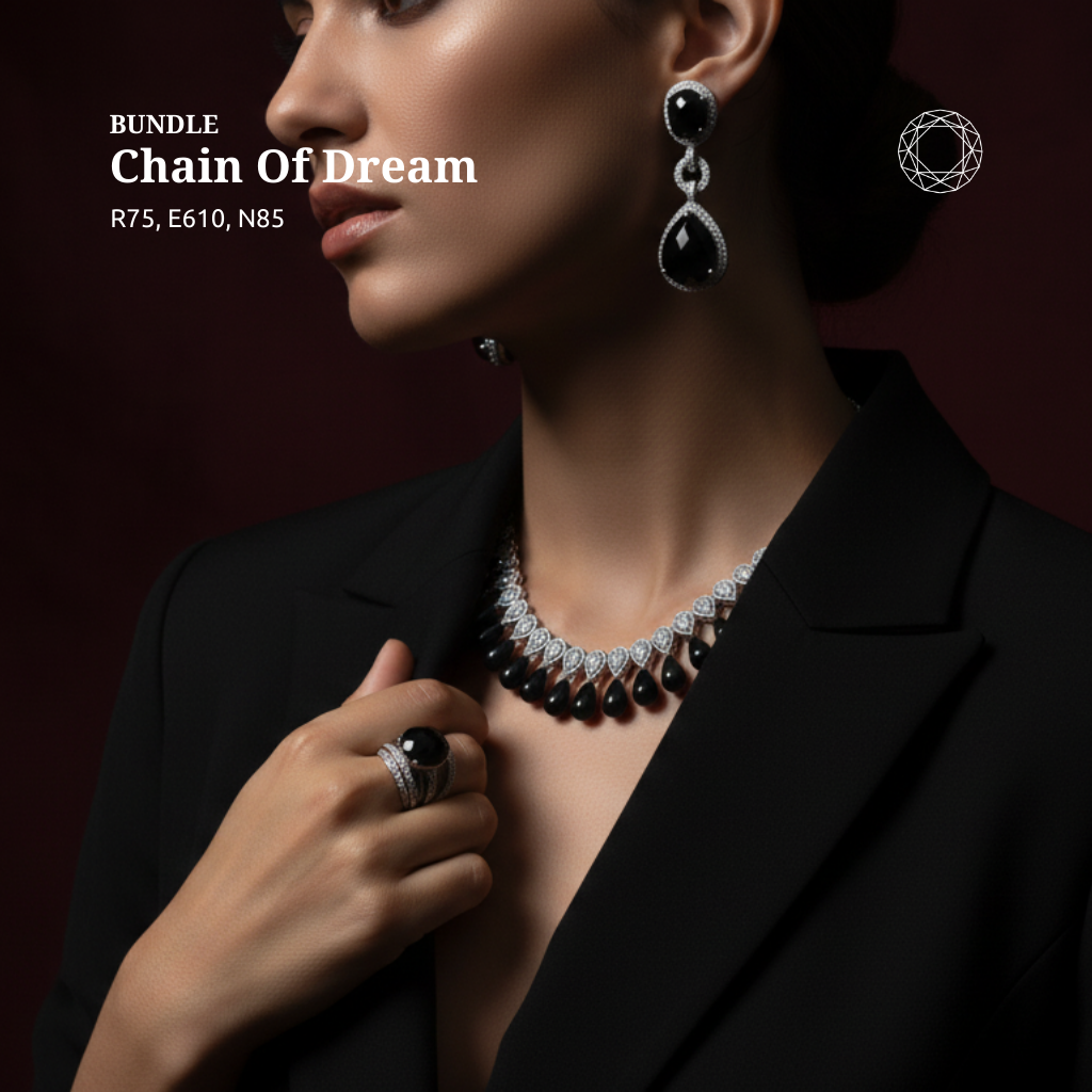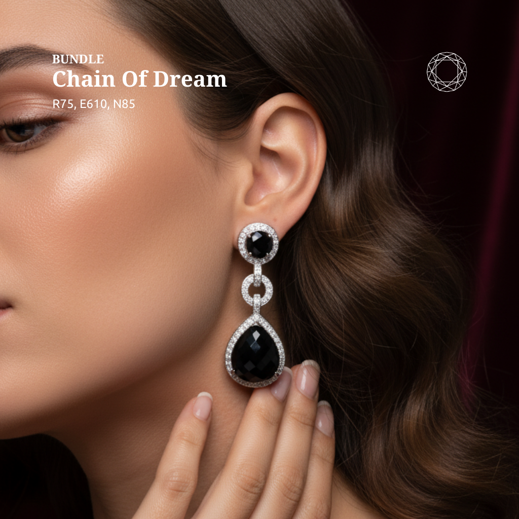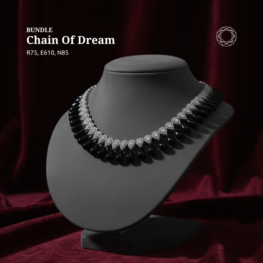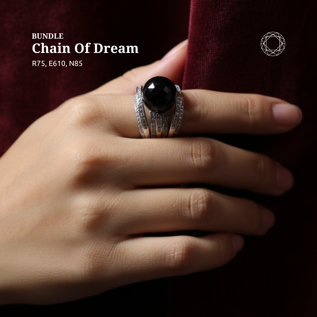Chain of Dream เป็นเซ็ตเครื่องประดับที่ถักทอความฝันผ่านการเชื่อมโยงระหว่างนิลเมืองกาญจน์และเพชรเจิดจรัส ด้วยดีไซน์ที่สะท้อนความสัมพันธ์ ความหวัง และพลังภายในอย่างสง่างาม