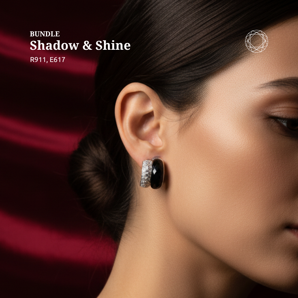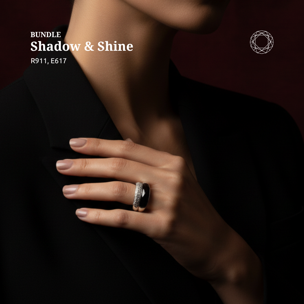 Shadow & Shine เกิดจากการจับคู่ที่ตรงข้ามกันอย่างงดงาม — นิลเมืองกาญที่ดำลึกดุจเงา และเพชรที่สว่างไสวเหมือนแสงดาว เมื่ออยู่ด้วยกัน ทั้งสองไม่แย่งกัน แต่กลับเสริมให้กันและกันโดดเด่นขึ้น เงาทำให้แสงยิ่งเปล่งประกาย และแสงทำให้เงามีความหมาย